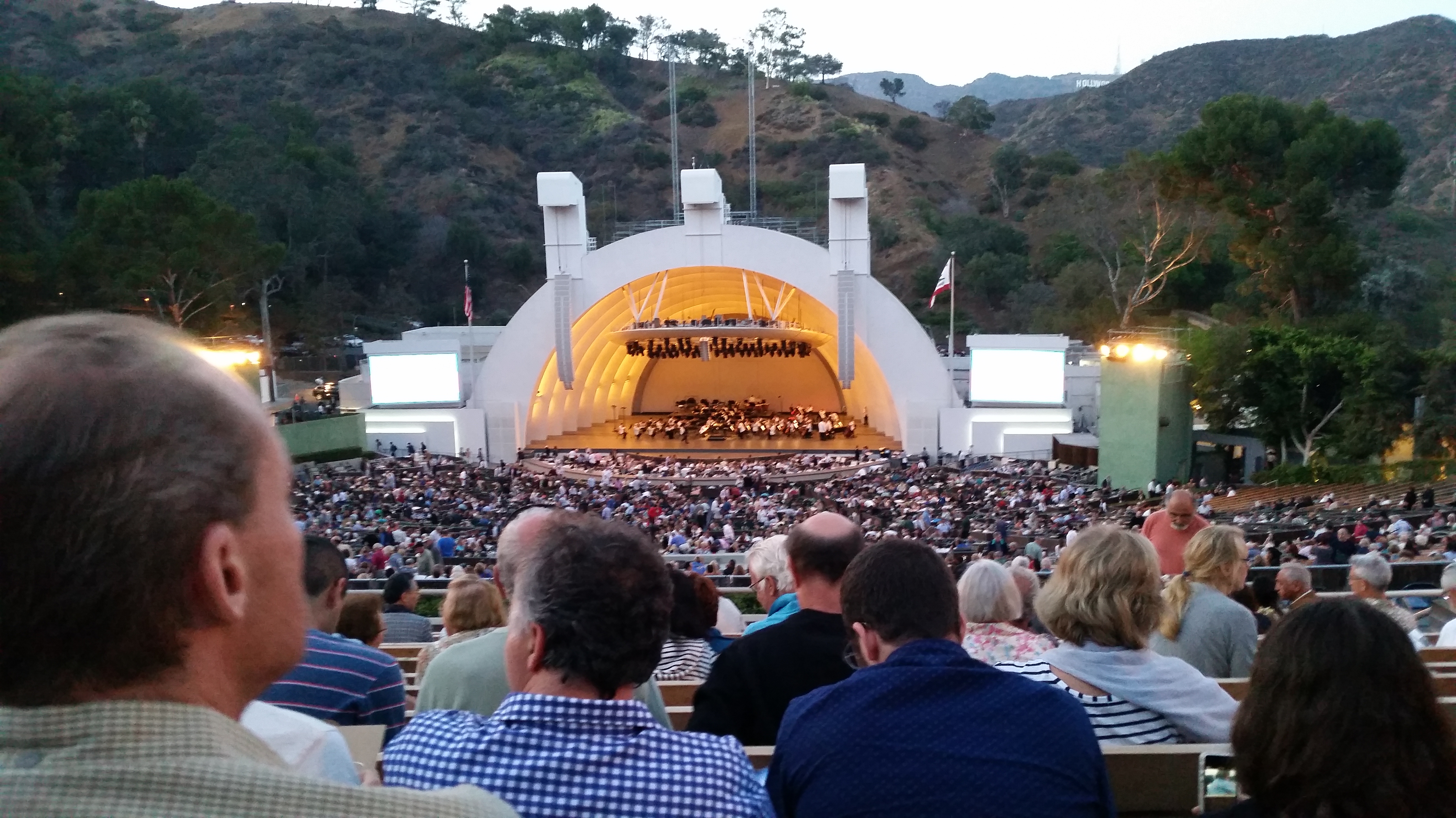 But yeah, Goldstone was such an incredible experience not because we got to see anything in particular, or that we even got to see many things, but because we stood face-to-face with the same antennae that made science history, the same communications centers that facilitate the 30 hour round trip communication with the Voyager spacecraft (yes, they’re really that far out now).In any case, my day did not end there, which it very well might have due to the five hour round-trip. Instead, I got home at 6 and immediately headed off with friends to a concert at the Hollywood Bowl! I’ve never been there before, and since there were discounts on Groupon I decided to steal an $18 dollar ticket and head on out. Below is a picture of the stage before the concert started (you might be able to see the Hollywood sign in the top right on the hills):
