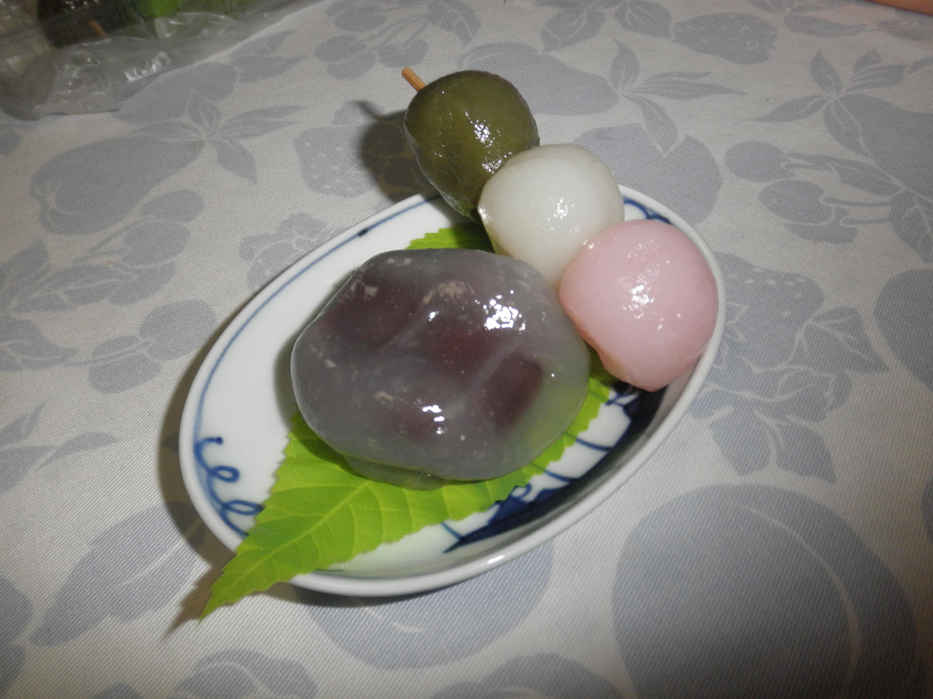 And since I have such a sweet tooth, just fruit is never enough! These are some traditional Japanese sweets. On the right is "sanshoku dango" or three-colored dango whose color imitates that of the sakura (cherry blossom) trees. Dango is made from sweetened rice powder, formed into these balls, and skewered three on a stick. On the left is "kuzu manju", a type of sweet that contains sweet red bean paste in the middle and a sticky outisde made from the kuzu potato.