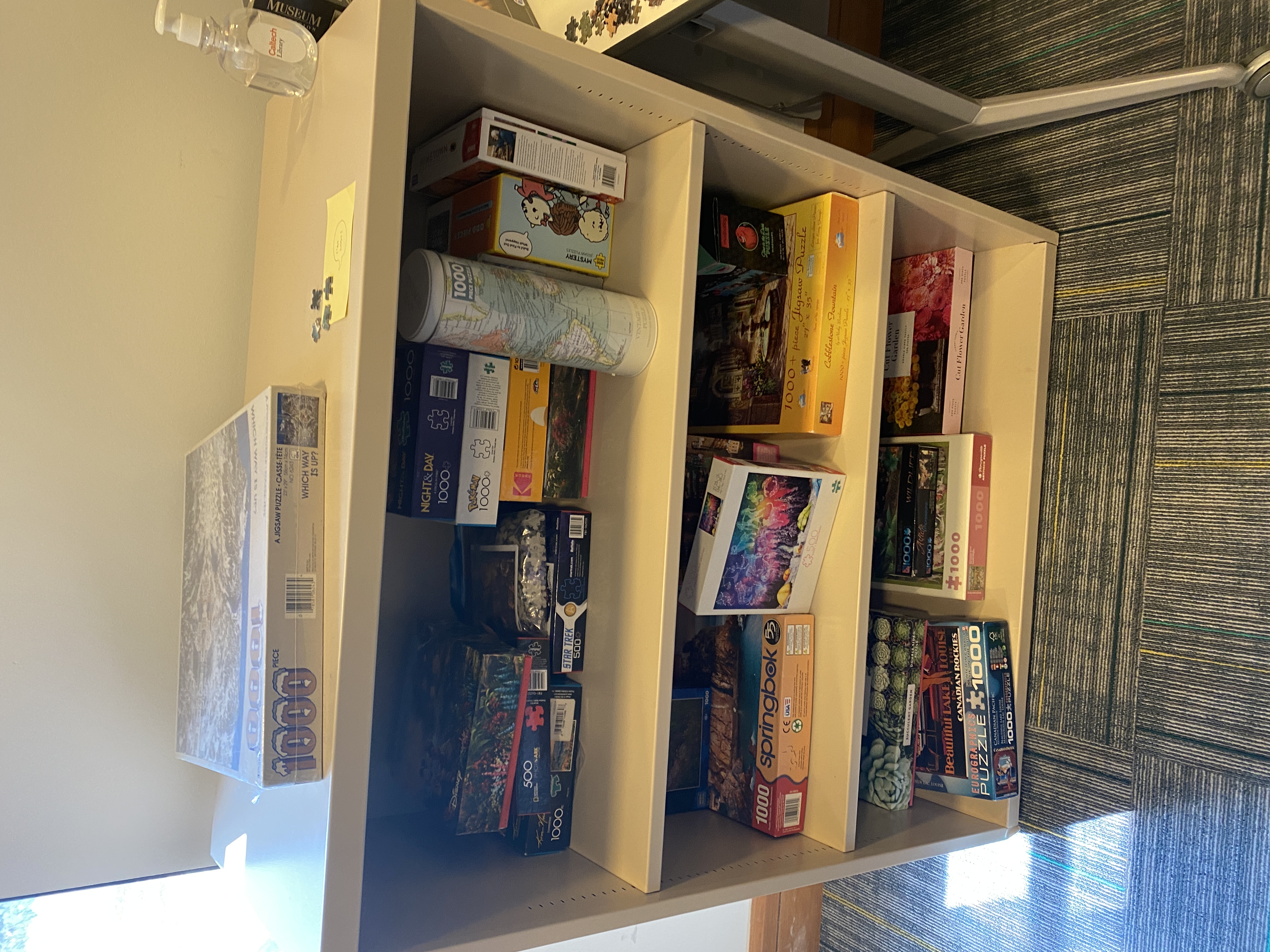 If you happen to be on Caltech campus and you are stressed about something, whether that be academic or non-academic, I greatly recommend trying out some of our puzzles on campus. There are multiple puzzles on the first floor of Sherman Fairchild Library and the third floor of Tianqiao and Chrissy Chen Neuroscience Research building. Here are some of the photos of the puzzles in those locations: